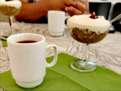 Meillä on hyvää jälkiruokaa, ja meille on saatavilla kahvia, viinejä, alkoholia, olutta, vettä ja suolaa.